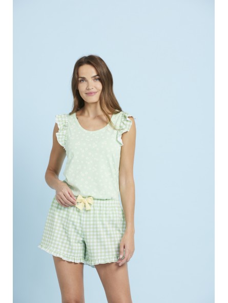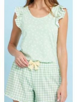 Pigiama donna cotone margherita top spalla larga con dettaglio rouches e stampa con margherite e pantalone corto con stampa vichy e fiocco
