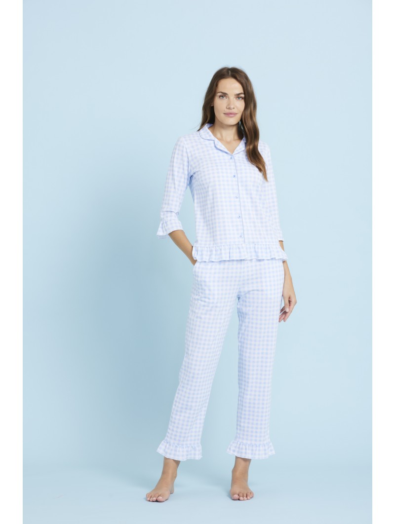 Pigiama donna cotone eva top con manica 3/4 con rouches colletto con rever e scollatura a V pantalone capri con rouches e con stampa vichy