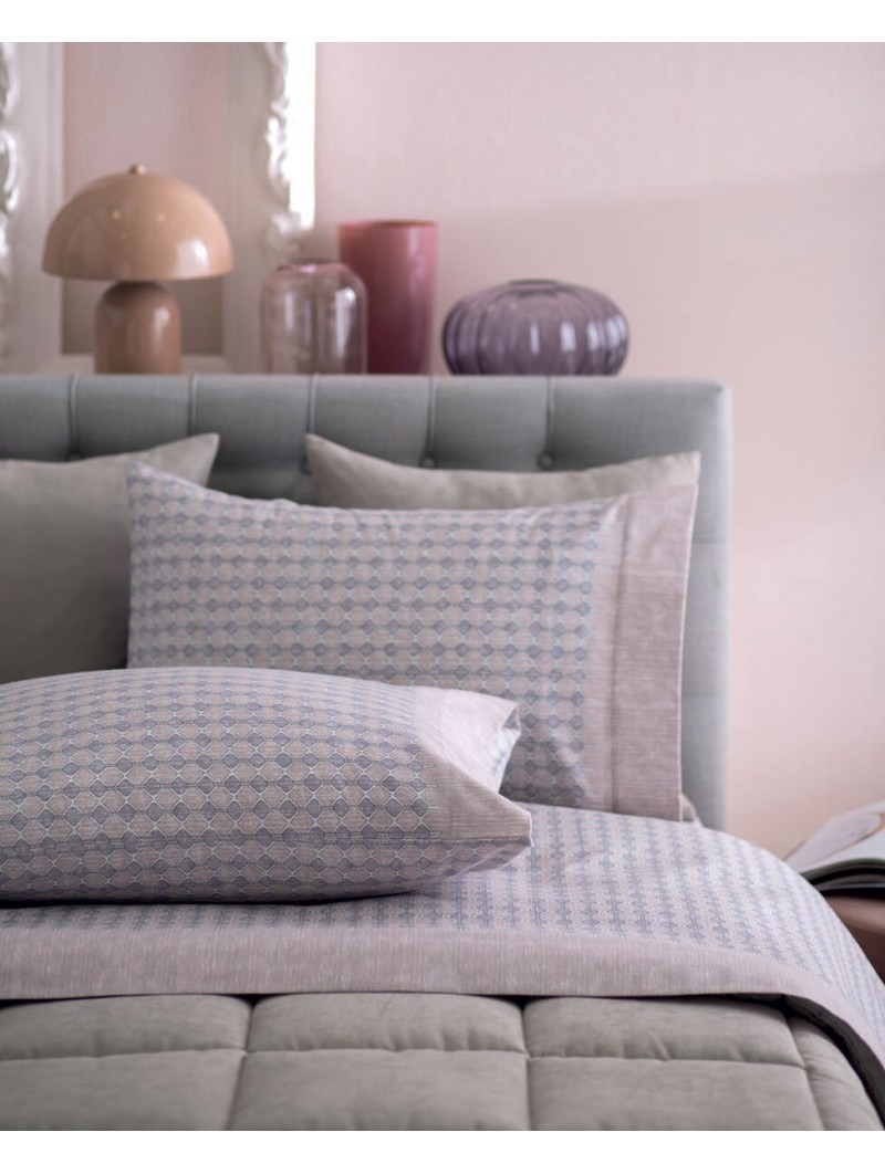 Completo lenzuola matrimoniale in caldo cotone con stampa piazzata stampa piazzata e orlo finito 8 cm, federe piazzate a sacchetto, lenzuolo sotto con angoli stampato coordinato.
