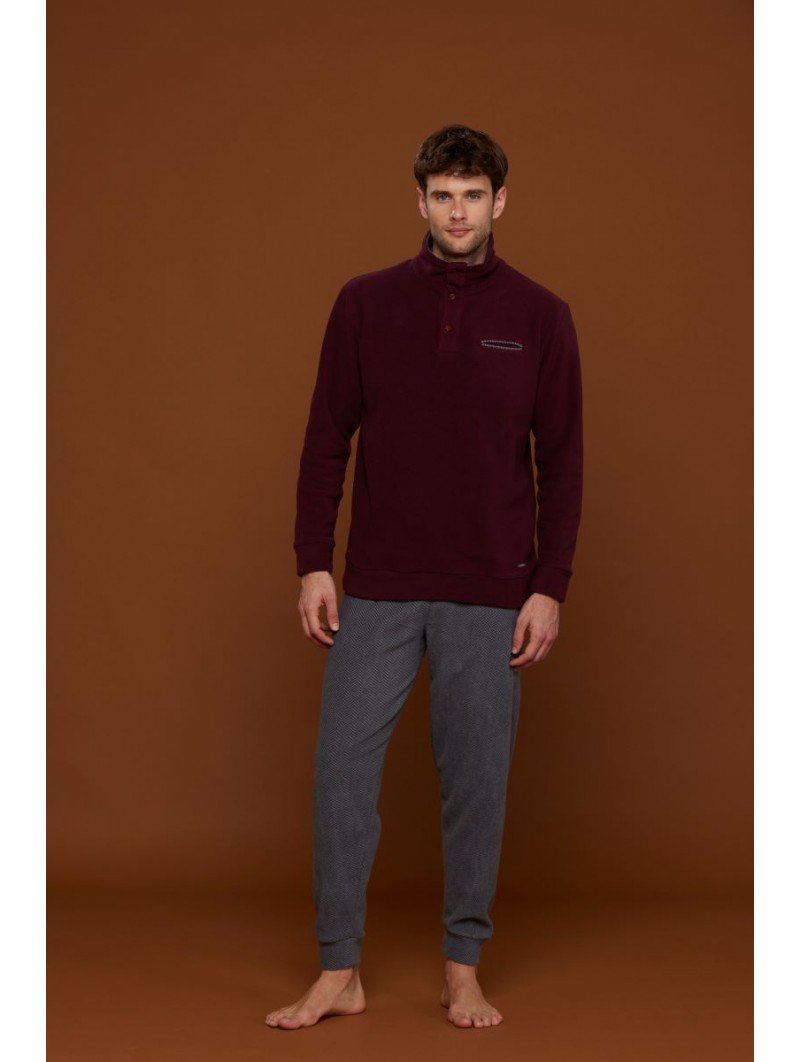 Pigiama uomo micropile spinato top bordeaux manica lunga con polsino e taschino e pantalone grigio con stampa spinata, coulisse e polsini