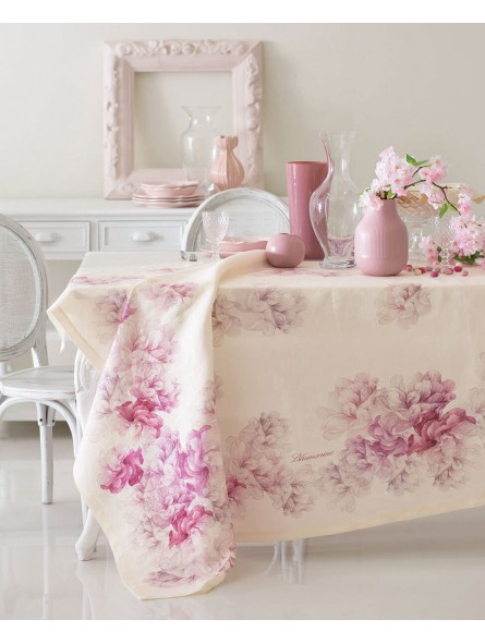 Tovaglia da 10/12 posti in lino con stampa piazzata e logo Blumarine nella trama, elegantemente confezionata in scatola, perfetta come idea regalo.