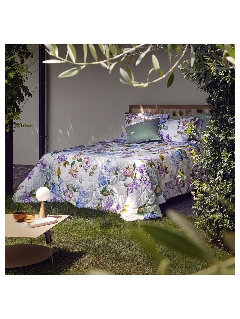 La tradizione di Fazzini per la bella biancheria a stampa floreale fa un’incursione anche nella P/E 2024 con la collezione Camelia, che rende omaggio al fascino dei giardini italiani. Il brand impreziosisce il tema floreale che traduce in ogni stagione con nuove fantasie, mescolando sobrio romanticismo e voglia di freschezza. Le camelie, le ortensie e le fresie fioriscono sul quilt trapuntato facendo incontrare in una delicata armonia il malva, l’azzurro e il bianco. Il disegno realizzato prima ad acquarello viene stampato per portare la meraviglia della primavera in camera da letto. Trapuntato a capo, è rifinito a mano con due angoli sagomati Ovatta Talko® creata con micro fibre calandrate di bassa denaratura. La calandratura della superficie impedisce il peeling e rallenta la penetrazione dell'aria fredda dall'esterno, creando condizioni di benessere ottimali.
