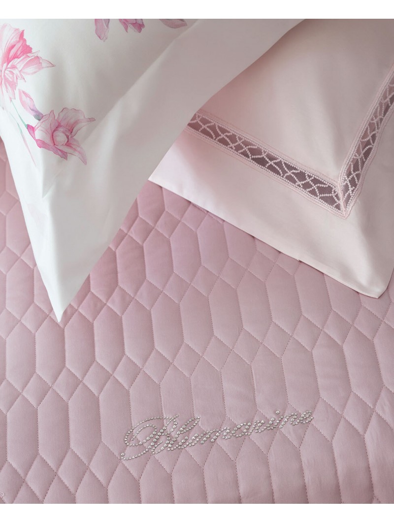 Copriletto matrimoniale trapuntato in percalle tinta unita con logo Blumarine in cristalli.