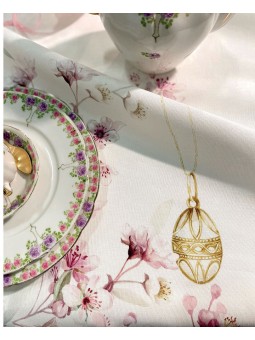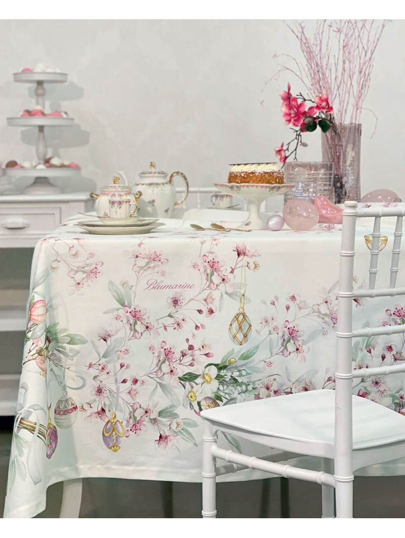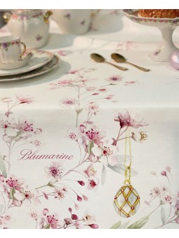 Tovaglia per 10/12 posti in panama con stampa piazzata e logo Blumarine nella trama, elegantemente confezionata in scatola, perfetta come idea regalo.