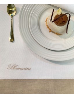 Tovaglia per 10/12 posti tinta unita bianca con bordo colorato in lino rimesso in applicazione alto 9,5 cm, logo Blumarine ricamato in tono con le fasce, elegantemente confezionata in scatola, perfetta come idea regalo.