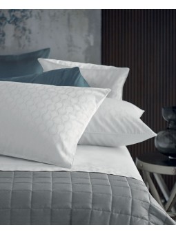 Completo lenzuola matrimoniale in jacquard di cotone rifinito con coda di topo tono su tono, lenzuolo sopra tinta unita con fascia applicata jacquard, federe a sacchetto rifinite con coda di topo e retro tinta unita.