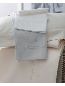 Completo lenzuola matrimoniale in raso di cotone tinta unita rifinito con doppio a-jour, logo Blumarine ricamato sul lenzuolo sopra e monogramma B ricamato sulle federe.