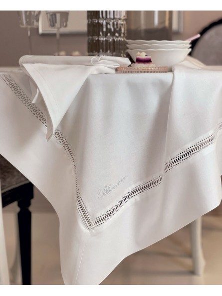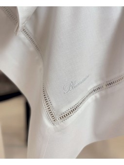 Raffinata tovaglia tinta unita in misto cotone rifinita con gigliuccio e logo Blumarine ricamato.
