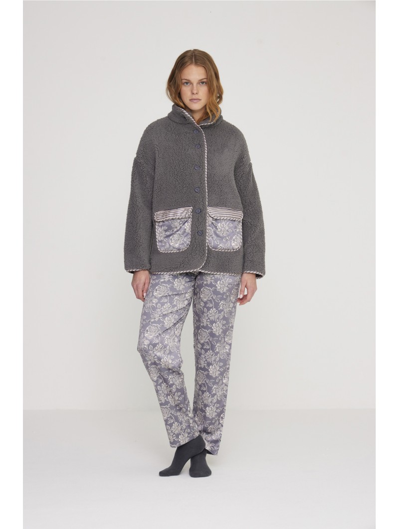 Giacca donna lisette in eco pelliccia e raso con abbottonatura centrale, profilo a contrasto e tasche sul davanti con stampa a fiori e righe