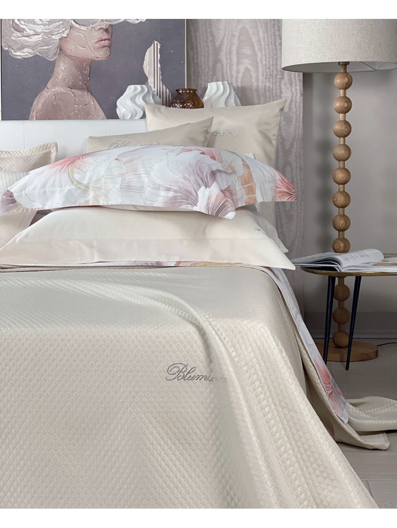 Copriletto matrimoniale liscio non trapuntato in piqué jacquard con logo Blumarine in cristalli e angolo stondato in caduta.