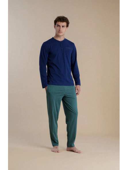Pigiama uomo in 100% cotone top a maniche lunghe blu, con scollo tre bottoni e dettagli sul taschino, si abbina ai pantaloni verdi a righe SENZA tasche per un tocco classico e raffinato