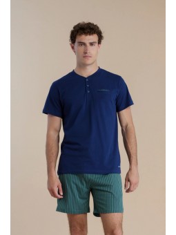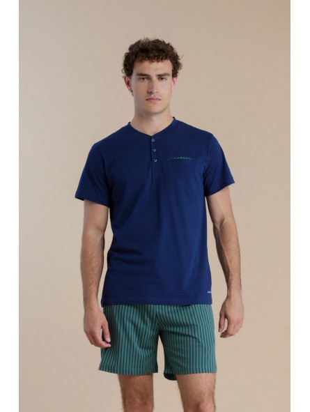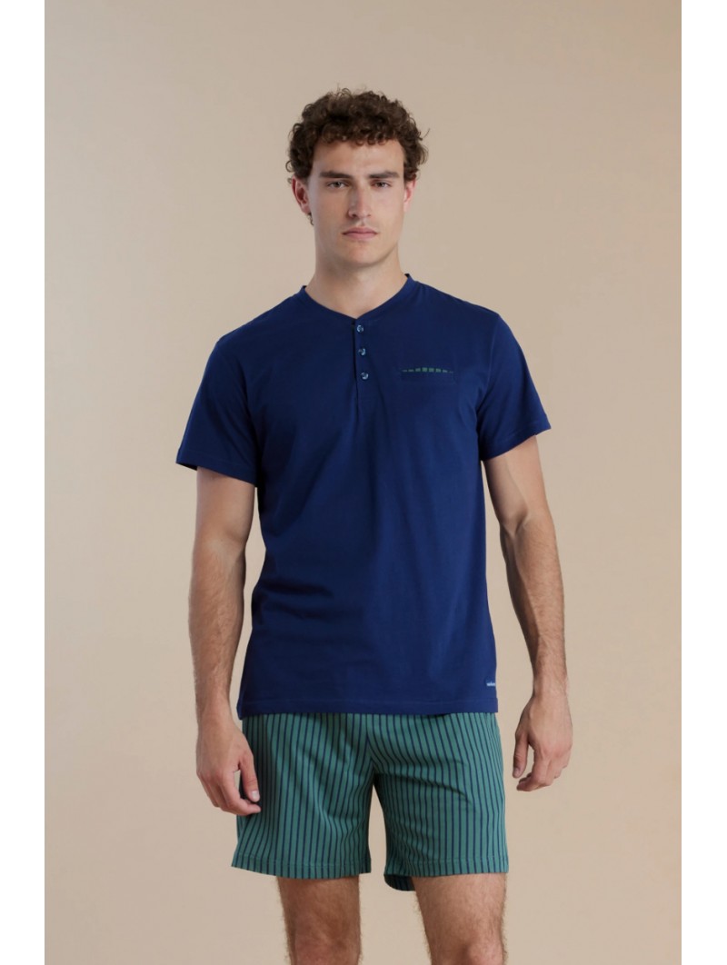 Pigiama uomo in 100% cotone top maniche corte con collo tre bottoni e taschino decorato si abbina ai pantaloncini verdi a righe. Perfetto per rilassarsi con eleganza.