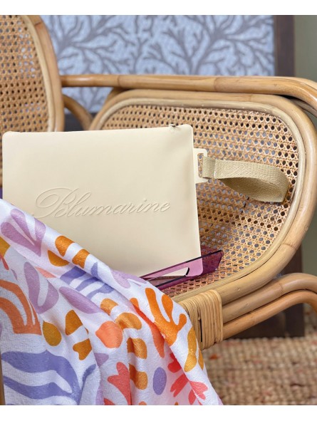 Pochette da mare in Lycra, elegante e versatile, con logo stampato a caldo per un tocco distintivo. Dotata di un bracciale da polso in corda, alto 3 cm, che unisce funzionalità e stile.