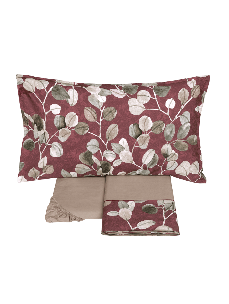 Entrambi i lati delle federe a quattro volanini e l'alta balza del lenzuolo, impreziosita da codina a contrasto, sono in percalle di puro cotone stampato in digitale. Il resto del completo è in percalle di puro cotone tinta unita.
