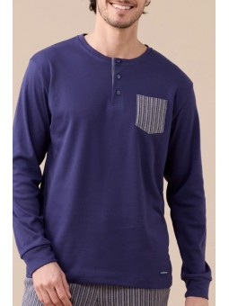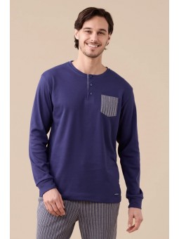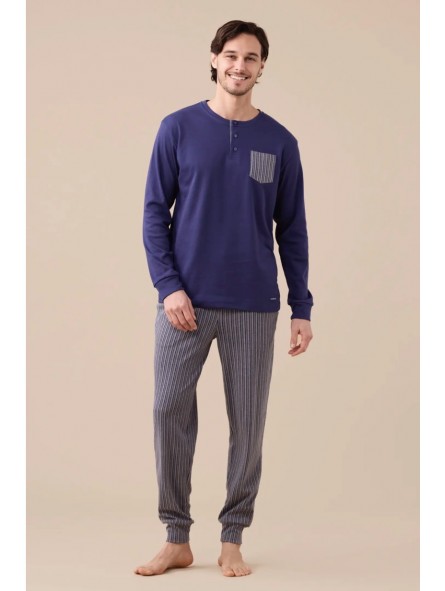 Pigiama uomo in caldo cotone felpato, top di colore unito con collo a tre bottoni e pantaloni in stampa rigata con polsino.