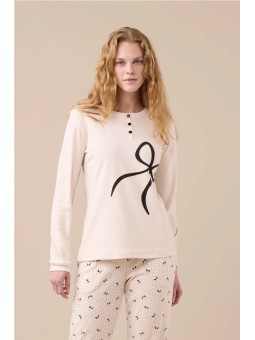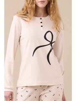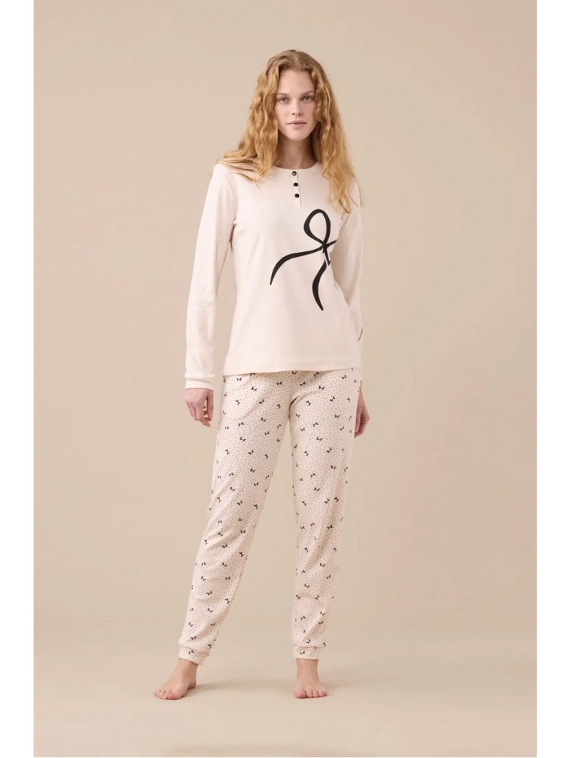 Pigiama donna invernale in caldo cotone con top panna a manica lunga a tre bottoni e maxi fiocco stampato. Pantaloni con fantasia fiocchi e polsino.