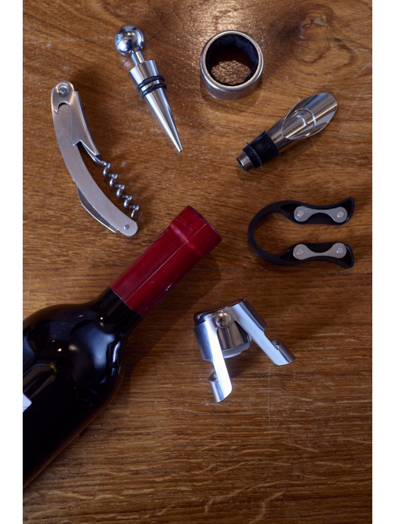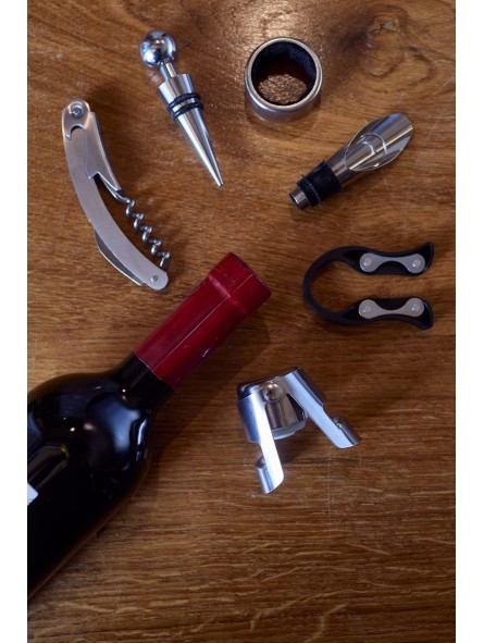 Un’elegante set composto da apribottiglie, anello salvagocce, tappo e beccuccio, versatore.. ideale per chi ama il vino e i dettagli di classe. Ogni accessorio è progettato per unire funzionalità e stile: dall’apribottiglia ergonomico per un’apertura semplice e sicura, al tappo che mantiene intatti aroma e freschezza. Una selezione indispensabile per trasformare ogni degustazione in un’esperienza unica, sofisticata, memorabile.