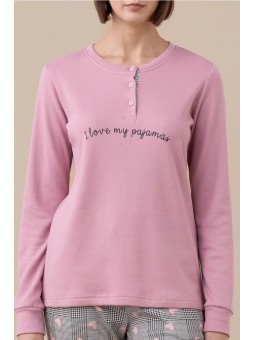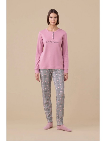Pigiama donna in caldo cotone felpato con stampa principe di Galles con cuoricini. Top a tre bottoni con scritta applicata e pantaloni con tasche e polsini sul fondo.