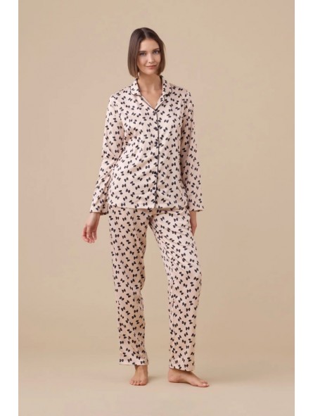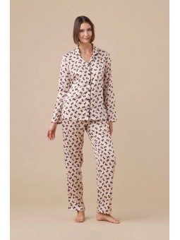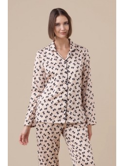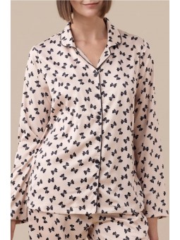 Pigiama donna in raso con top taglio uomo con abbottonatura sul davanti, stampa fiocco e profili a contrasto. Pantaloni stampati.