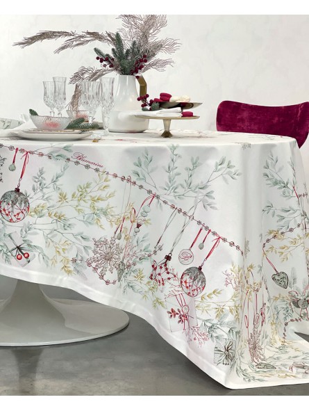 Tovaglia per 10/12 posti in panama con stampa piazzata, orlo con angoli a cappuccio, logo Blumarine stampato nella trama.