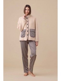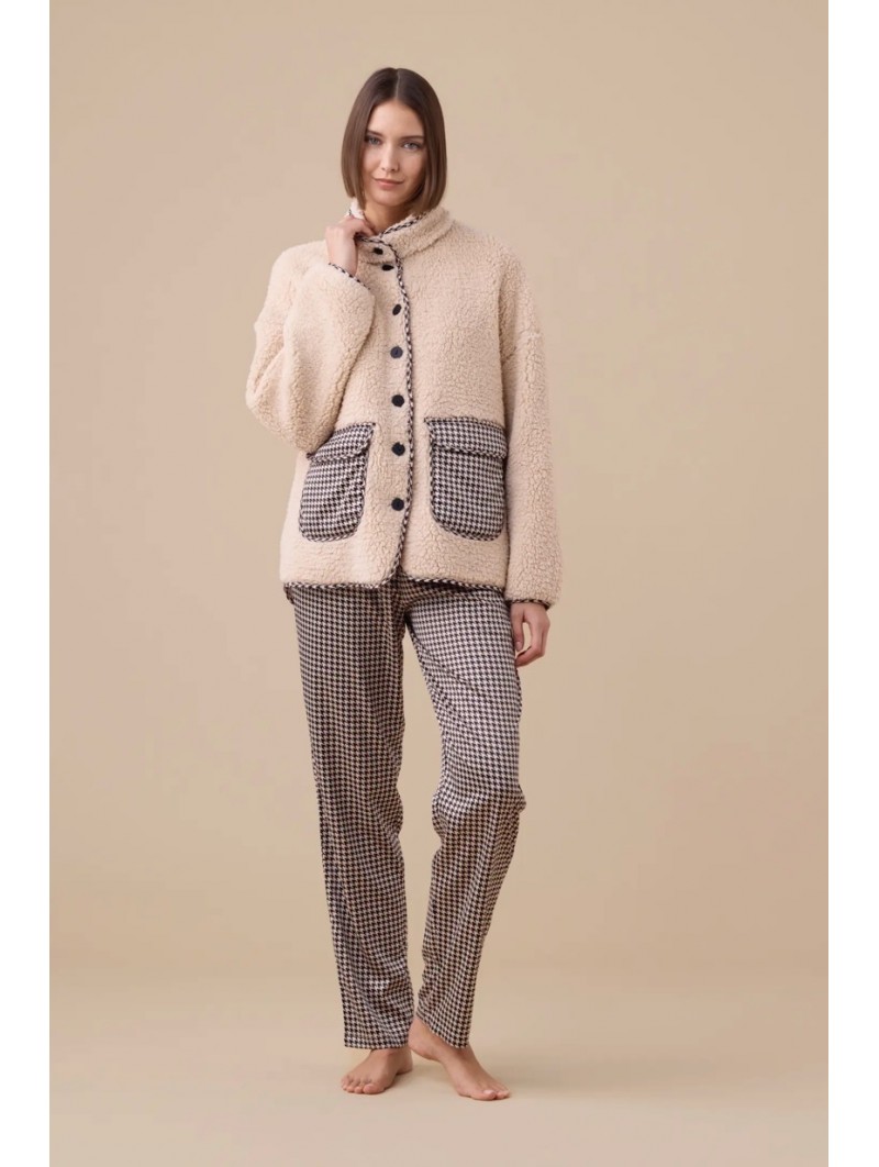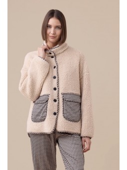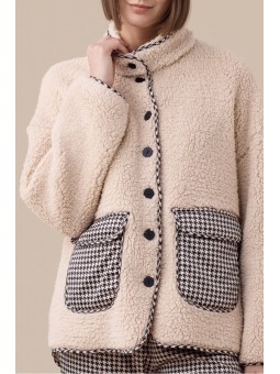 Giacca donna double face in eco-agnellino con abbottonatura sul davanti, collo alto, profili e tasche in raso con stampa pied de poule..