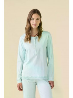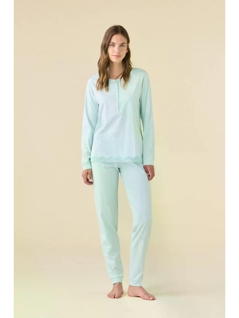 Pigiama donna estivo 100% cotone. Top manica lunga con collo a cinque bottoni e pizzo sul fondo. Pantalone lungo con polsini.