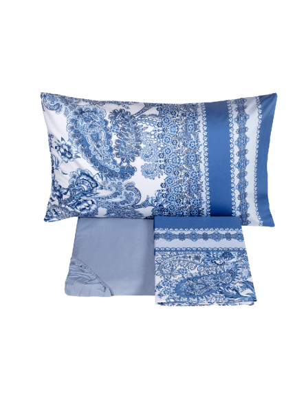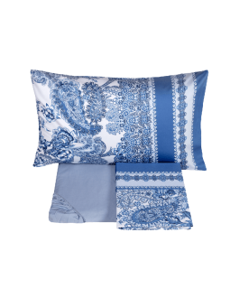 Il lenzuolo copriletto e le federe sono stampati. Il lenzuolo con angoli è in tinta unita.