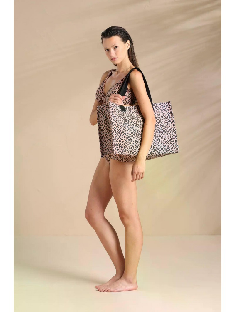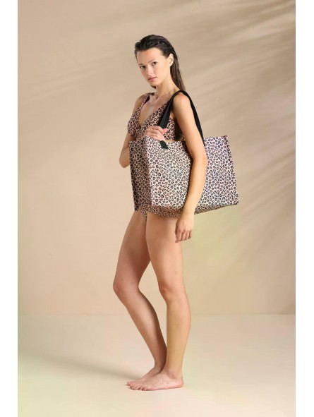 Borsa mare donna in tessuto con stampa maculata, capiente e perfetta per la spiaggia e il tempo libero. Dotata di pratica chiusura con zip. Dimensioni 42x36x16cm