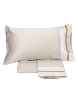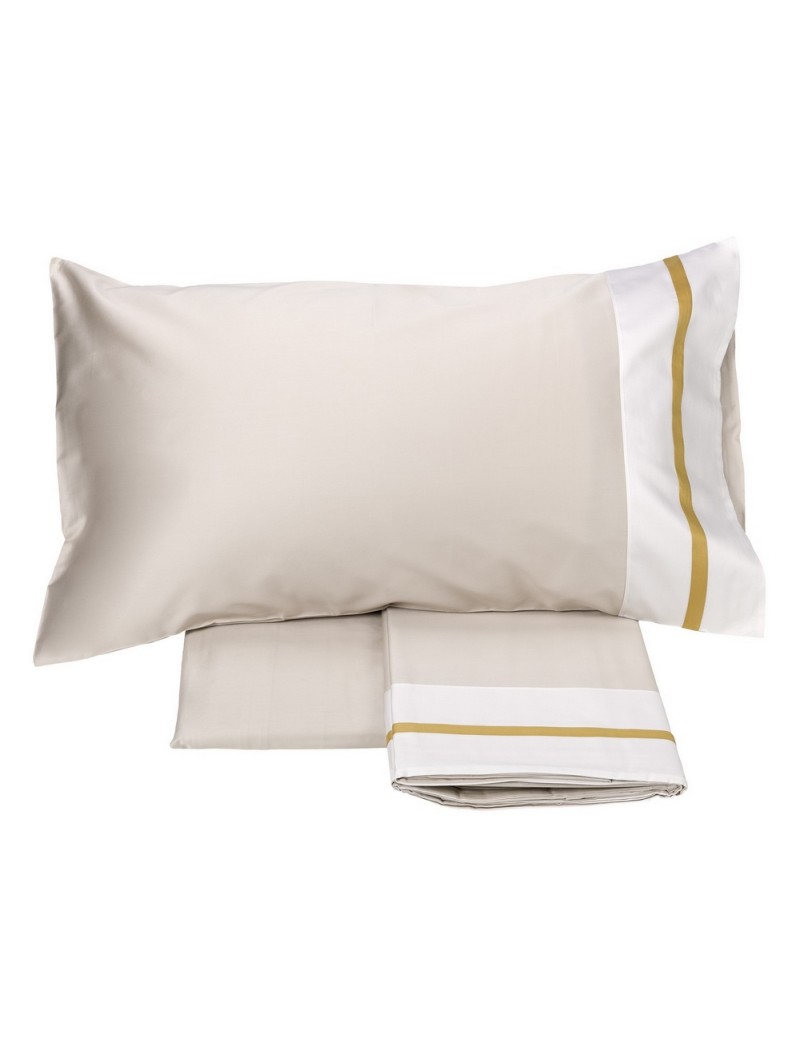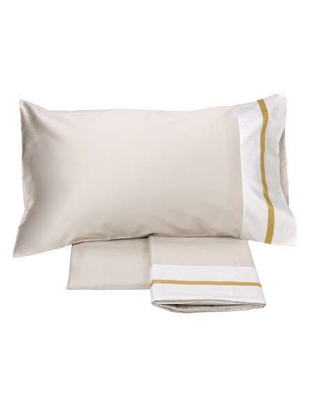 Il lenzuolo e le federe sono in satin 300 TC di puro cotone impreziositi da importante balza costruita con triplo passaggio. Il lenzuolo con angoli è in satin 300 TC tinta unita. 2 piazze: sopra cm 260X295 - sotto con angoli cm 180X200X30 - federe cm cm 52X82