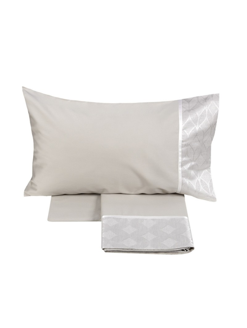 Un'importante balza realizzata in prestigioso tessuto damascato tinto in filodi nobili fibre di seta e lino è fermata al completo di raso 300 TC tinta unita con un bordino applicato in doppio. 2 piazze: sopra 260x295 cm - sotto 180x200x30 cm - federe 52x82 cm