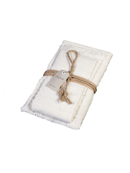Spugna di 550 gr/m2 in Puro Cotone con lavorazione jacquard e frange. Coppia 1+1: ospite 40x60 cm e asciugamano 60x110 cm