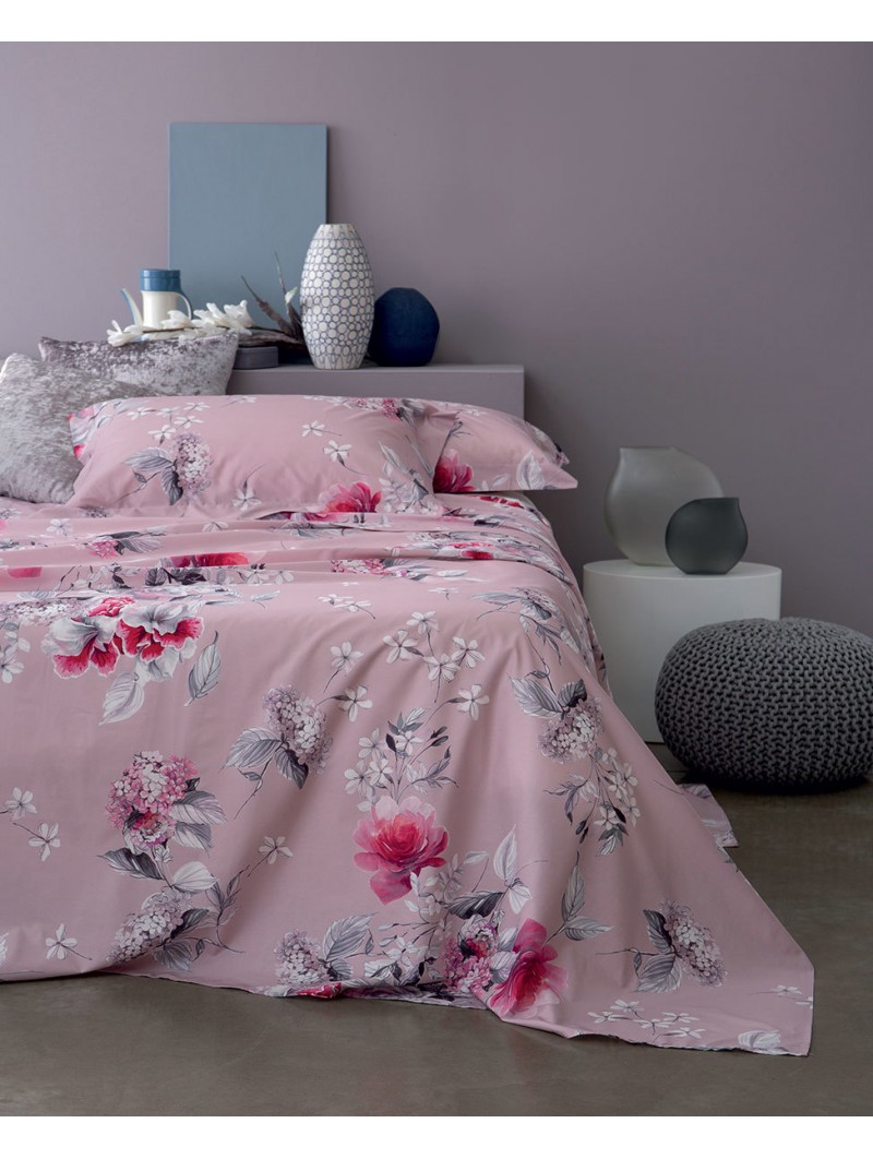 Completo modello lenzuola-copriletto estivo matrimoniale con stampa a fiori, lenzuolo sotto in percalle tinta unita.
