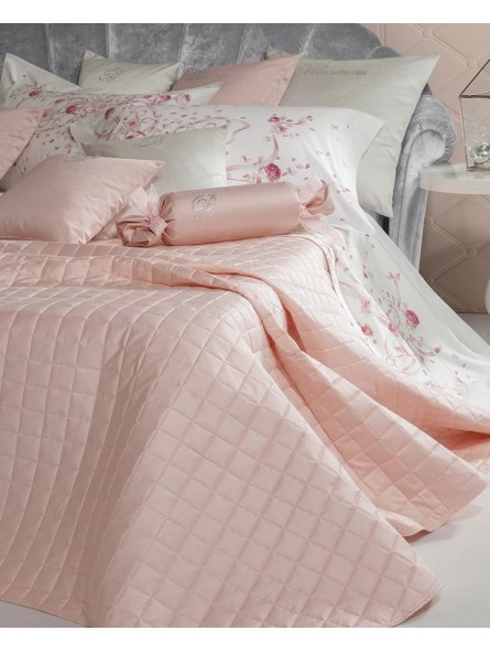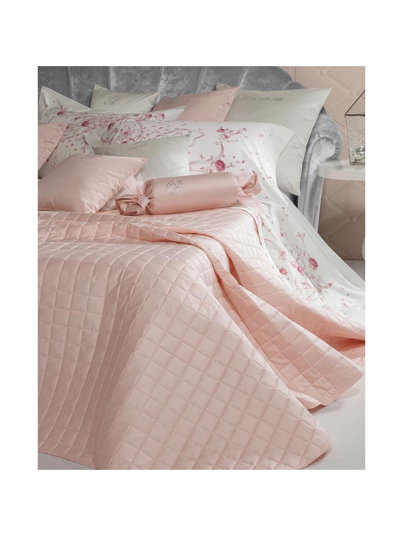 Copriletto matrimoniale trapuntato  in puro raso di cotone tinta unita con logo Blumarine in cristalli Swarovski.