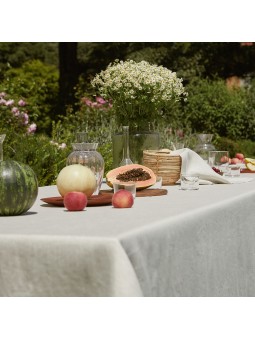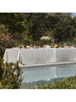 Lino 100% con trattamento Pentec che dona aspetto fresco, volume ed elasticità, garantendo una completa assenza di pilling. Balza di 9 cm e angoli a cappuccio. Tovaglia: 180x280 cm