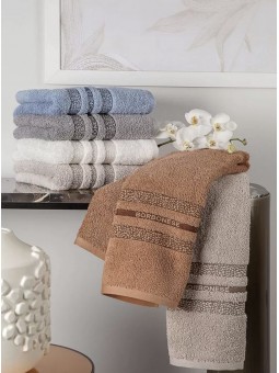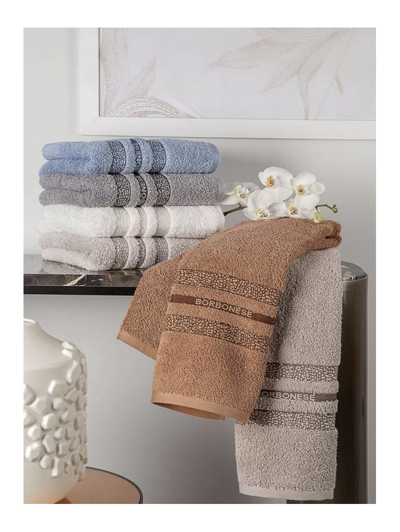 Set 1+1 asciugamani tinta unita con fasce fantasia Op e logo Borbonese.