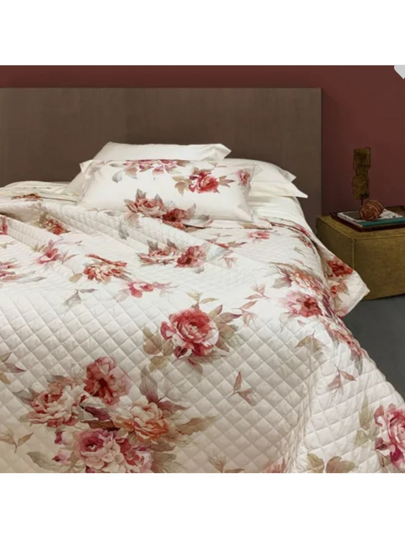 Fresco copriletto matrimoniale trapuntato con classica stampa a fiori su fondo chiaro.