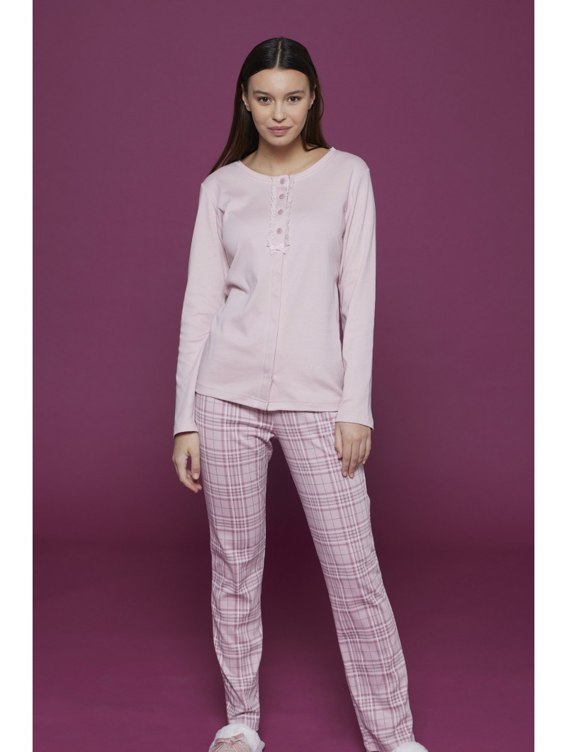 Pigiama donna 100% cotone martina con pantalone con stampa scozzese e top rosa con dettagli in pizzo