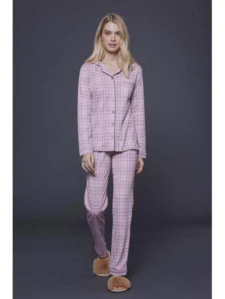 Pigiama donna maria con stampa scozzese rosa top abbottonato manica lunga con rever e scollo a V pantalone lungo senza polsino
