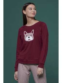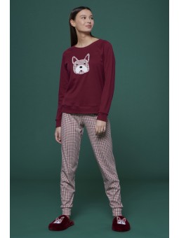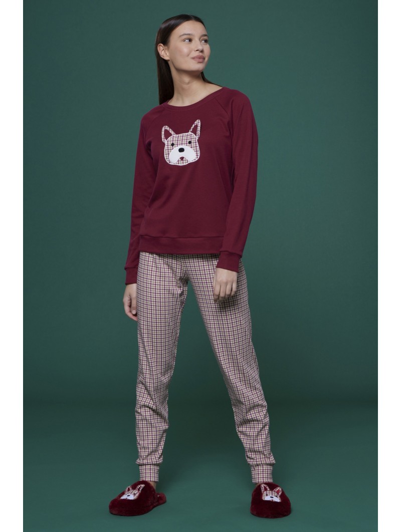Pigiama donna caldo cotone dogghi con pantalone stampato con polsino e top rosso con applicazione